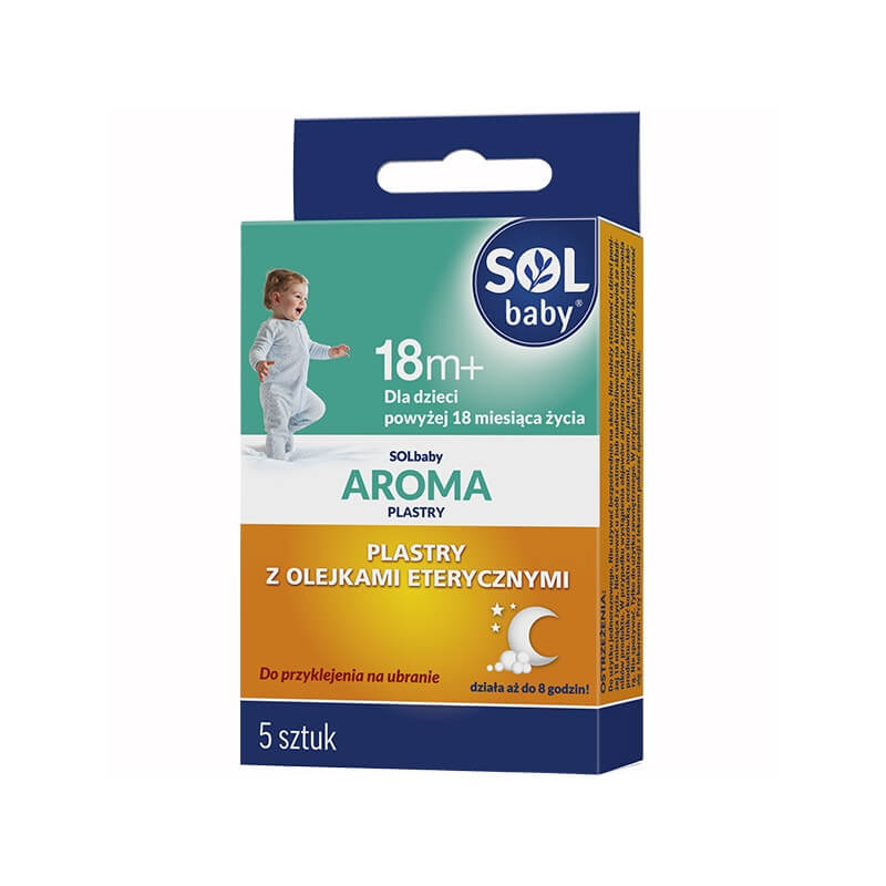 Plastry z olejkami eterycznymi do przyklejenia na ubranie. SOLbaby AROMA PLASTRY zawiera kompozycje 8 olejków eterycznych: eukaliptusowego, miętowego, sosnowego, cytrynowego, pomarańczowego, rozmarynowego, anyżowego, goździkowego w formie samoprzylepnego plastra. Dzięki unikalnej budowie warstwowej, plastry Solbaby Aroma zapewniają powolne uwalnianie kojącego zapachu aż do 8 godzin.