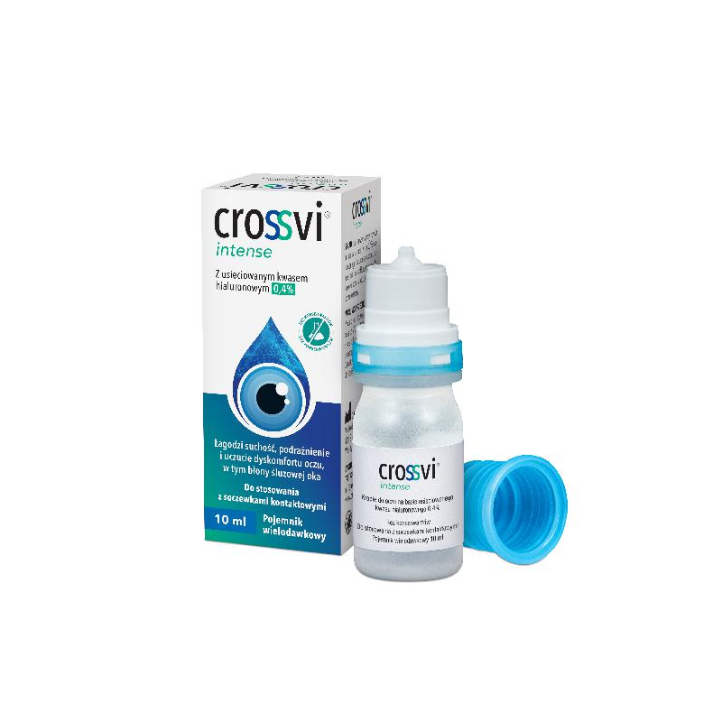 CROSSVI Intense to jałowy roztwór o fizjologicznym pH, przeznaczony do stosowania w okulistyce. Wykorzystuje opatentowaną metodę sieciowania kwasu hialuronowego (HA) przy użyciu mocznika, co pozwala wzmocnić i udoskonalić właściwości mechaniczne klasycznego, liniowego HA. Dzięki procesowi sieciowania, kwas hialuronowy staje się znacznie bardziej odporny na działanie hialuronidazy, a tym samym utrzymuje się dłużej na powierzchni oka. W rezultacie zapewnia intensywniejszy i bardziej długotrwały efekt nawilżenia oraz lepsze właściwości lubrykacyjne niż jego niesieciowana forma.