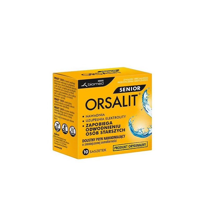 Środek do postępowania dietetycznego w stanach odwodnienia organizmu u osób starszych, szczególnie podczas biegunki lub wymiotów oraz w sytuacjach, w których występuje ryzyko odwodnienia, jak np. podczas upału, wysiłku fizycznego, czy w stanach chorobowych z gorączką. Produkt zawiera cukier. ORSALIT SENIOR to produkt bezglutenowy, nie zawiera białka mleka i laktozy.