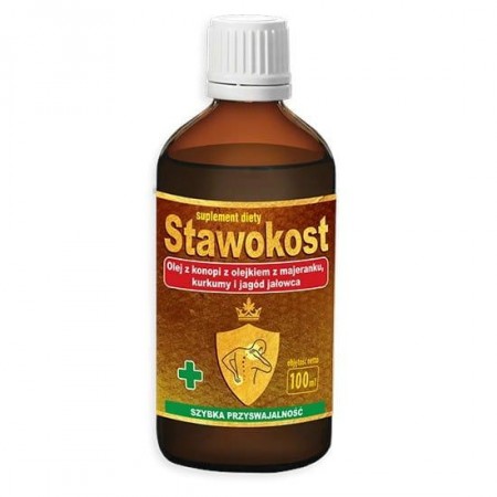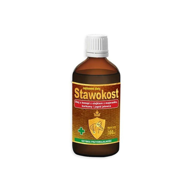 Cztery olejki ziołowe tworzą skład suplementu diety Stawokost krople. Preparat zawiera olejek z konopi siewnej (źródło kannabinoidów), olejek z jagód jałowca, olejek z kłącza kurkumy, olejek z majeranku. Uzupełnianie codziennej diety w te składniki wspiera utrzymanie prawidłowej kondycji stawów. Preparat dedykowany osobom dorosłym, które chcą zadbać o stan swoich pleców, bioder, kolan i dłoni.