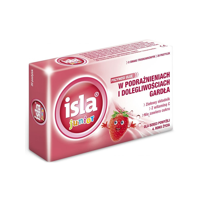 Pastylki do ssania o smaku truskawkowym zawierają składniki które chronią suchą i podrażnioną błonę śluzową jamy ustnej i krtani oraz pomagają zwalczyć dolegliwości gardła, takie jak drapanie w gardle i chrypka. Ekstrakt z porostu islandzkiego uwalnia się podczas ssania i tworzy powłokę ochronną, która działa jak balsam na podrażnioną błonę śluzową jamy ustnej, gardła i krtani. Preparat zawiera witaminę C, cynk i pantotenian wapnia. Nie zawiera sztucznych aromatów, barwników i konserwantów.
