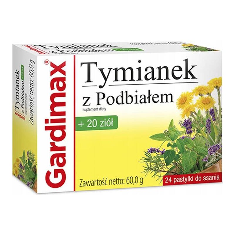 Gardimax Tymianek z podbiałem + 20 ziół to suplement diety polecany do stosowania wspomagającego przy podrażnieniu gardła, krtani i strun głosowych. Przeznaczony dla młodzieży powyżej 12. roku życia i osób dorosłych.
