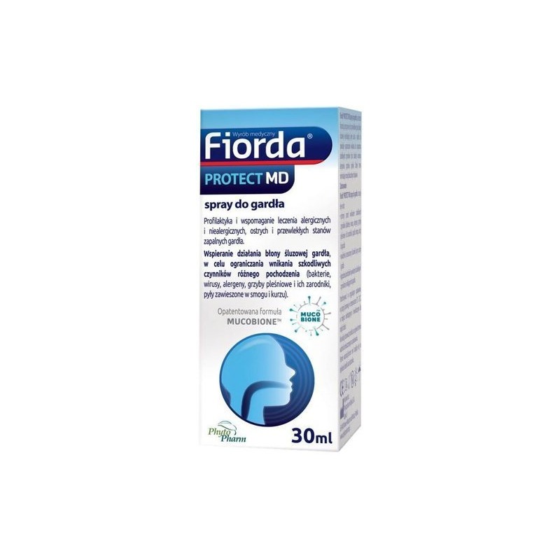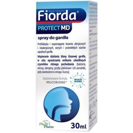 Wyrób medyczny Fiorda Protect MD spray do gardła przeznaczony do stosowania jako ochrona przed wnikaniem do gardła alergenów oraz innych czynników szkodliwych – wirusów, bakterii, grzybów pleśniowych i ich zarodników, kurzu, cząstek smogu, a także jako środek nawilżający w przypadku przesuszonej błony śluzowej jamy ustnej i gardła lub środek łagodzący podrażnienia spowodowane wnikaniem do gardła alergenów i innych czynników szkodliwych.