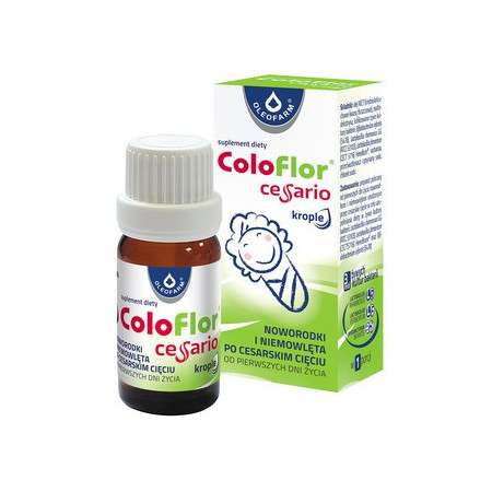 Coloflor Cesario - suplement diety, zawierający 3 szczepy bakterii kwasu mlekowego - Lactobacillus rhamnosus GG, Lactobacillus fermentum Hereditum, Bifidobacterium infantis oraz inuline - substancję prebiotyczną. Produkt przeznaczony dla noworodków, niemowląt urodzonych przez cesarskie cięcie.