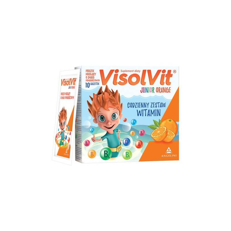 Visolvit Junior Orange - suplement diety zawierający zestaw witamin wspomagające odporność. Produkt przeznaczony dla dzieci powyżej 3 roku życia i młodzieży.