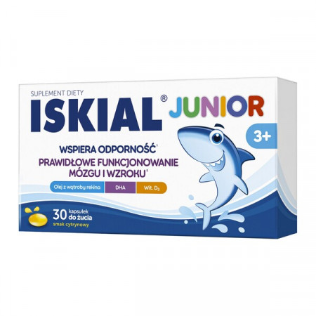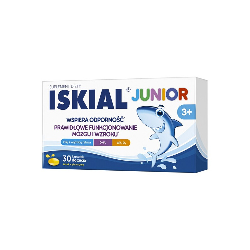 Iskial Junior - suplement diety zawierający olej z wątroby rekina oraz witaminę D. Produkt przeznaczony dla dzieci powyżej 3 roku życia.