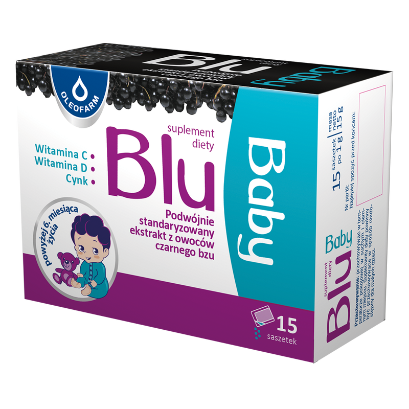 Suplement diety Blu Baby to preparat zawierający w składzie podwójnie standaryzowany na zawartość polifenoli i antocyjanów ekstrakt z owoców czarnego bzu, witaminę C, cynk oraz witaminę D.