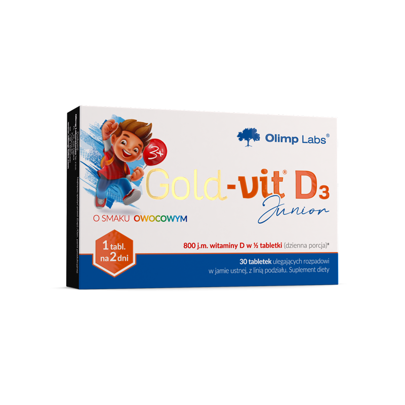 Suplement diety Olimp Gold-Vit® D3 Junior powstał z myślą o dzieciach powyżej 3 roku życia, w celu uzupełnienia codziennego odżywiania o odpowiednio dobraną porcję witaminy D.