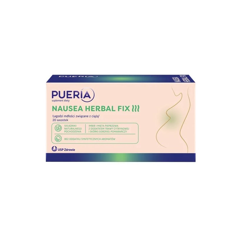 Pueria Nausea Herbal Fix - to suplement diety w postaci saszetek do zaparzania, który zawiera liście mięty pieprzowej, trawy cytrynowej, kłącze imbiru oraz skórkę gorzkiej pomarańczy. Produkt przeznaczony dla kobiet w ciąży.