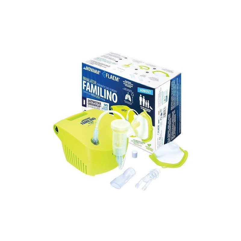 Inhalator pneumatyczno-tłokowy NOVAMA FAMILINO firmy FLAEM. Odpowiedni dla wszystkich grup wiekowych, w tym dzieci. Kompletny zestaw do terapii aerozolowej, idealny do użytku domowego, w którego skład wchodzi cichy kompresor z możliwością nieprzerwanej bezawaryjnej pracy (praca ciągła), o miłej dla ucha barwie dźwięku i kompletny zestaw akcesoriów wraz z innowacyjnym nebulizatorem RF8 Evo z systemem oszczędzania leku i 2 trybami nebulizacji. Zastosowanie: zapalenie oskrzeli, zapalenie krtani, zapalenie płuc, przeziębienie, kaszel, katar, astma, zapalenie zatok. Spektrum leków i preparatów: większość leków do nebulizacji, sól fizjologiczna, hipertoniczny roztwór soli fizjologicznej, sól fizjologiczna z kwasem hialuronowym (wyjątek na rynku inhalatorów).