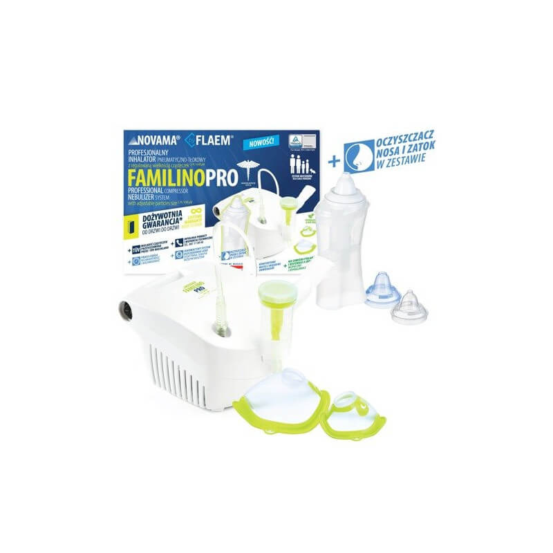 Inhalator pneumatyczno-tłokowy NOVAMA FAMILINO firmy FLAEM. Odpowiedni dla wszystkich grup wiekowych, w tym dzieci. Kompletny zestaw do terapii aerozolowej, idealny do użytku domowego, w którego skład wchodzi cichy kompresor z możliwością nieprzerwanej bezawaryjnej pracy (praca ciągła), o miłej dla ucha barwie dźwięku i kompletny zestaw akcesoriów wraz z innowacyjnym nebulizatorem RF8 Evo z systemem oszczędzania leku i 2 trybami nebulizacji. Zastosowanie: zapalenie oskrzeli, zapalenie krtani, zapalenie płuc, przeziębienie, kaszel, katar, astma, zapalenie zatok. Spektrum leków i preparatów: większość leków do nebulizacji, sól fizjologiczna, hipertoniczny roztwór soli fizjologicznej, sól fizjologiczna z kwasem hialuronowym (wyjątek na rynku inhalatorów).
