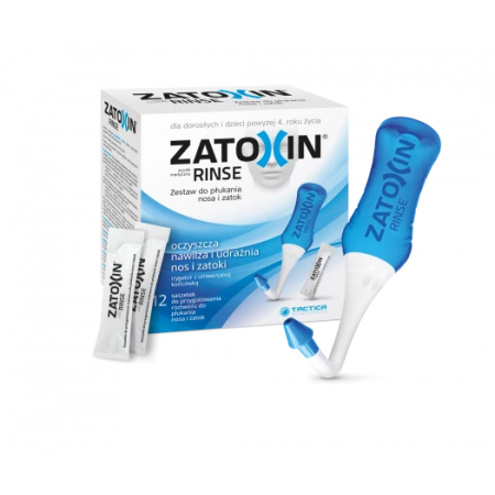 Zatoxin Rinse pozwala na dokładne oczyszczenie nosa i zatok z zalegającej wydzieliny, alergenów oraz patogenów, tym samym ograniczając gromadzenie się czynników, które mogą powodować infekcję. Dodatkowo wyrób nawilża suchą i podrażnioną błonę śluzową nosa i zatok. Unikalna konstrukcja irygatora umożliwia płukanie nosa i zatok w łatwy i kontrolowany sposób – bez użycia dodatkowej siły i bez konieczności ściskania butelki.