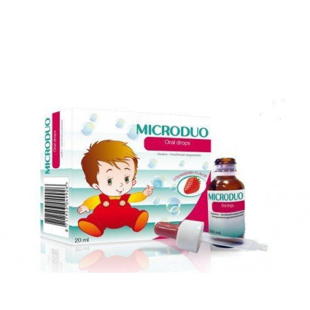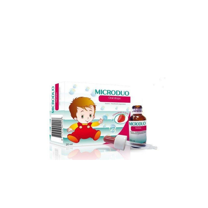 Główną rolę w MICRODUO pełni symetykon, którego właściwością chemiczno-fizyczną jest obniżanie napięcia powierzchniowego. Działanie symetykonu polega na tym, że pęcherzyki gazu z przewodu pokarmowego łączą się tworząc wolny gaz, który jest łatwo eliminowany. Łagodzi to wszystkie dokuczliwe objawy (ból, skurcze, uczucie napięcia, odbijanie, gazy) związane ze wzdęciami, typowe dla wielu chorób przewodu pokarmowego.