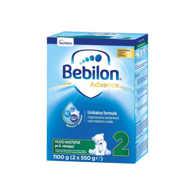 Bebilon 2 Pronutra-Advance, mleko następne, proszek, 1100 g to środek spożywczy specjalnego przeznaczenia żywieniowego, dla niemowląt powyżej 6 miesiąca życia. Pronutra Advance to m. in. w tym witaminy A, C i D, nienasycone kwasy tłuszczowe DHA i ALA oraz kompozycja galaktooligosacharydów i fruktooligosacharydów, wzorowana na oligosacharydach występujących w mleku matki.