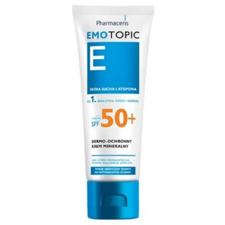• Dermo-ochronny krem mineralny do twarzy i ciała, SPF 50+ Pharmaceris E Emotopic jest polecany dla osób o skórze suchej i atopowej, jako ochrona przed słońcem, wiatrem i innymi drażniącymi czynnikami atmosferycznymi. Zawiera mineralne filtry przeciwsłoneczne (tlenek cynku i dwutlenek tytanu) oraz substancje nawilżające i natłuszczające. Krem wzmacnia ochronną barierę naskórka oraz zapobiega nasilaniu się objawów atopowego zapalenia skóry.