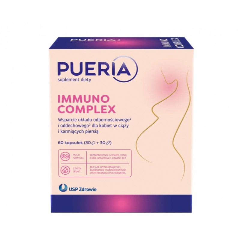Pueria Immuno Complex to kompleksowe wsparcie organizmu w postaci ziołowo–witaminowej MULTI FORMUŁY wzmocnionej ekstraktem z czosnku. To preparat złożony z 2 rodzajów kapsułek: z czosnkiem w bezzapachowej formie oraz ziołowo-witaminowej z ekstraktami z imbiru, czarnego bzu, witaminą C z soku z aceroli oraz cynkiem. W naturalny sposób wspiera siły obronne organizmu drogi oddechowe oraz komfort oddychania ciężarnej i karmiącej mamy. Produkt ma czysty skład – bez substancji wypełniających, barwników i konserwantów syntetycznego pochodzenia.