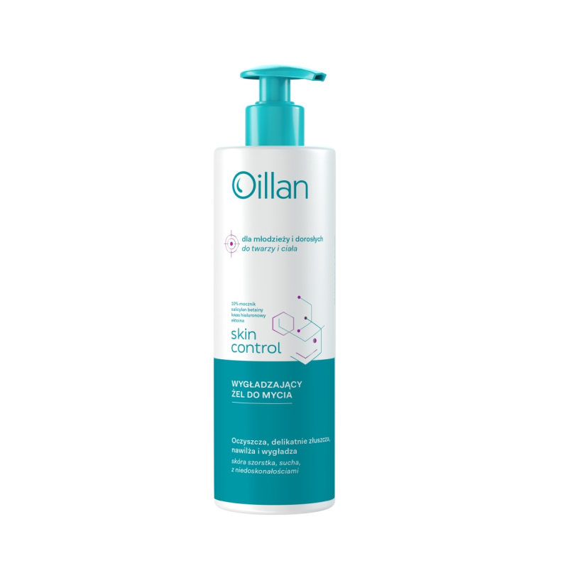 Wygładzający żel do mycia Oillan Skin Control skutecznie oczyszcza, delikatnie złuszcza, nawilża i wygładza skórę. Jest przeznaczony dla skóry szorstkiej, z grudkami, niedoskonałościami oraz suchej, zarówno do mycia ciała, jak i twarzy. Wspiera barierę ochronną skóry, pozostawiając uczucie komfortu, miękkości i nawilżenia.