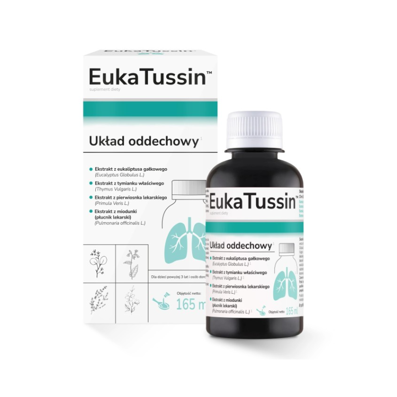 EukaTussin to suplement diety wspierający układ oddechowey. Zawiera starannie dobrane ekstrakty roślinne, które wspierają funkcjonowanie górnych dróg oddechowych i pomagają łagodzić dyskomfort w gardle.