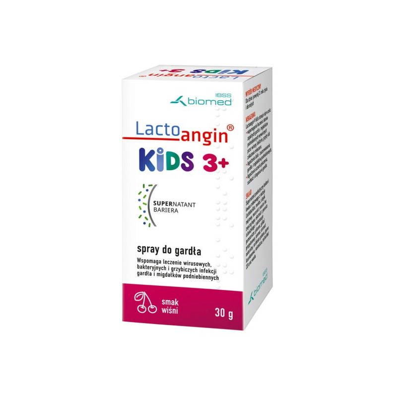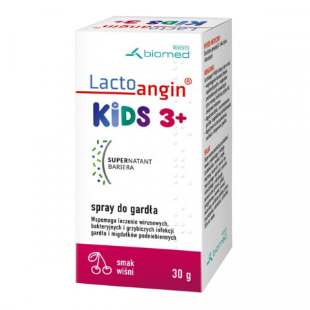 Spray do gardła Lactoangin KIDS to wyrób medyczny o smaku wiśniowym, przeznczony dla dzieci powyżej 3 roku życia jako środek wspomagający w trakcie infekcji gardła i migdałków podniebiennych.