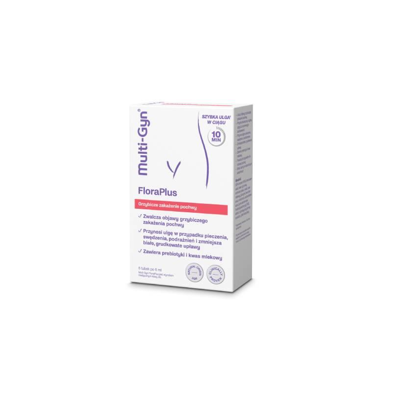Dzięki temu połączeniu Multi-Gyn FloraPlus skutecznie wspomaga leczenie infekcji grzybiczych oraz pomaga znormalizować pH i środowisko pochwy, sprzyjając jej zdrowiu i komfortowi.
