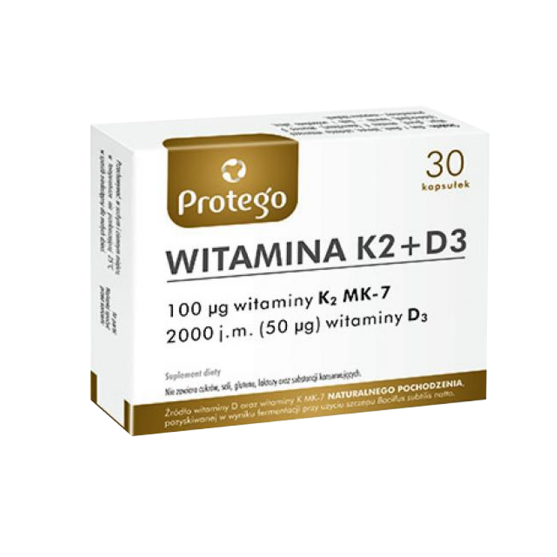 Protego Witamina K2 + D3 - suplement diety uzupełniający codzienną dietę w witaminę K2 MK-7 (menachinon-7) oraz D3 (). Preparat przeznaczony dla osób dorosłych.