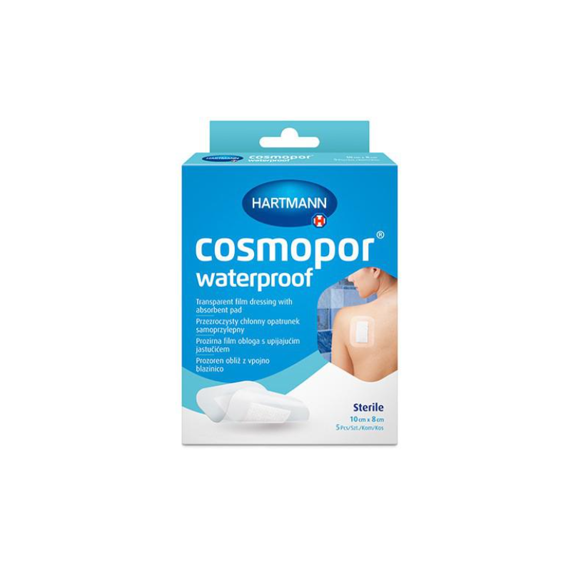 Cosmopor waterproof jest jałowym, wodoodpornym, samoprzylepnym opatrunkiem z warstwą chłonną. Jest wykonany z półprzepuszczalnej folii poliuretanowej, która zapewnia swobodne przenikanie pary wodnej i gazów, ale stanowi barierę dla wody i bakterii. Wkład chłonny jest pokryty siateczką, która zapobiega przywieraniu opatrunku do rany i ogranicza dyskomfort podczas zmiany opatrunku.