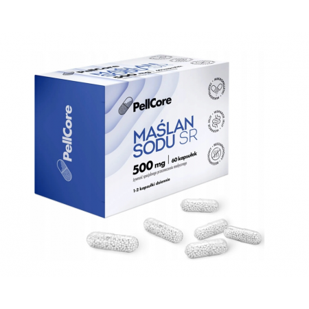PellCore Maślan Sodu SR 500 mg to żywność specjalnego przeznaczenia medycznego. Produkt zawiera 500 mg maślanu sodu zamkniętego w formie mikropeletek. Zastosowanie technologii „otoczkowania” pozwala na rozprowadzenie substancji aktywnej w obrębie jelita grubego. Dodatkowo zastosowana technologia pozwala na maskowanie charakterystycznego zapachu maślanu sodu.