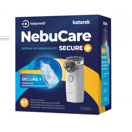 NebuCare Secure+ przeznaczony jest do nebulizacji dzieci podczas leczenia różnych schorzeń dróg oddechowych. W skład zestawu wchodzi nebulizator siateczkowy z zestawem dwóch maseczek i ustnika, oraz 40 ampułek roztworu soli fizjologicznej Katarek Secure+ w innowacyjnych ampułkach z okrągłym zakończeniem zapewniającym wyższy poziom bezpieczeństwa, co zmniejsza ryzyko urazów
