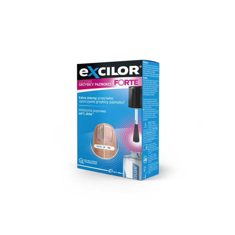 Excilor Forte płyn to wyrób medyczny w formie specjalistycznego lakieru, opracowany do leczenia onychomikozy (łagodnej i umiarkowanej grzybicy paznokci).