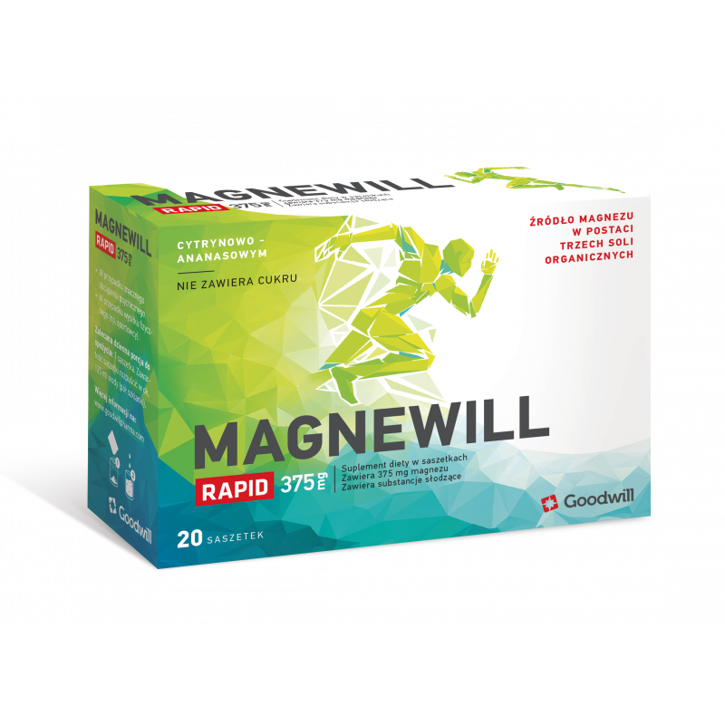 Suplement diety w postaci proszku do rozpuszczenia w wodzie, uzupełniający dietę w magnez o smaku cytrynowo-ananasowym.
