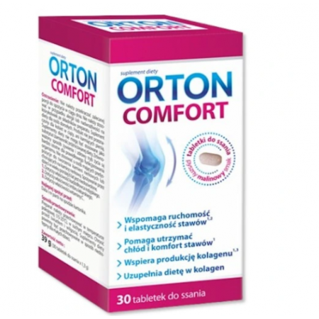 Orton Comfort zawiera kompozycję aż 6 składników aktywnych: hydrolizowany kolagen wołowy i drobiowy, witamina C, ekstrakt z gumożywicy Kadzidłowca indyjskiego, ekstrakt z kłącza Imbiru lekarskiego, kwas hialuronowy. wspomaga ruchomość i elastyczność stawów, pomaga utrzymać chłód i komfort stawów, wspiera produkcję kolagenu, uzupełnia dietę w kolagen