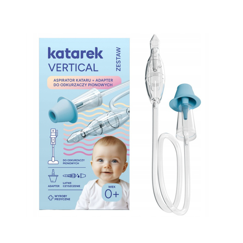 Wyrób medyczny – aspirator kataru dla dzieci do współpracy z odkurzaczami pionowymi o mocy >150 W. Służy do skutecznego i bezpiecznego usuwania wydzieliny z nosa, ułatwia oddychanie, działa oczyszczająco i udrażniająco na nos; do stosowania w dzień i w nocy. Przeznaczony do okolicy nosa/układu oddechowego. Zastosowanie zestawu: połączenie sprawdzonego aspiratora Katarek Plus z elastycznym adapterem do odkurzaczy pionowych. Uwaga: adapter nie współpracuje z odkurzaczami marek Samsung, VAX oraz modelami serii SLIM Dyson. Środki ostrożności (wybrane): w hemofilii konsultacja z lekarzem; przy użyciu u więcej niż jednego dziecka – używać czystego aspiratora; adaptera nie używać do innych celów ani z odkurzaczami przemysłowymi/centralnymi; nie zasłaniać otworów bocznych, nie stosować nadmiernej siły przy montażu, nie moczyć w wodzie z środkami dezynfekującymi, nie używać żrących detergentów; chronić przed temp. >40°C i <5°C; urządzenie stosują dorośli; w razie nasilenia objawów (np. kataru) skonsultować się z pracownikiem ochrony zdrowia.