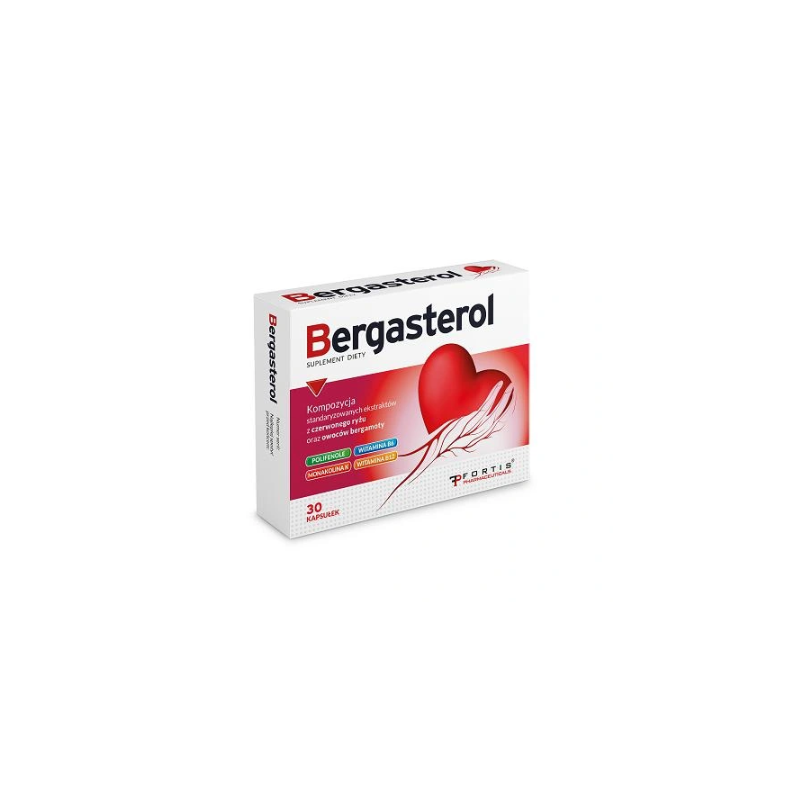 Uzupełnienie diety w składniki preparatu. Suplement diety Bergasterol zawiera kompozycję standaryzowanych ekstraktów z czerwonego ryżu i owoców bergamoty oraz witaminy z grupy B. Produkt przeznaczony dla osób dorosłych.