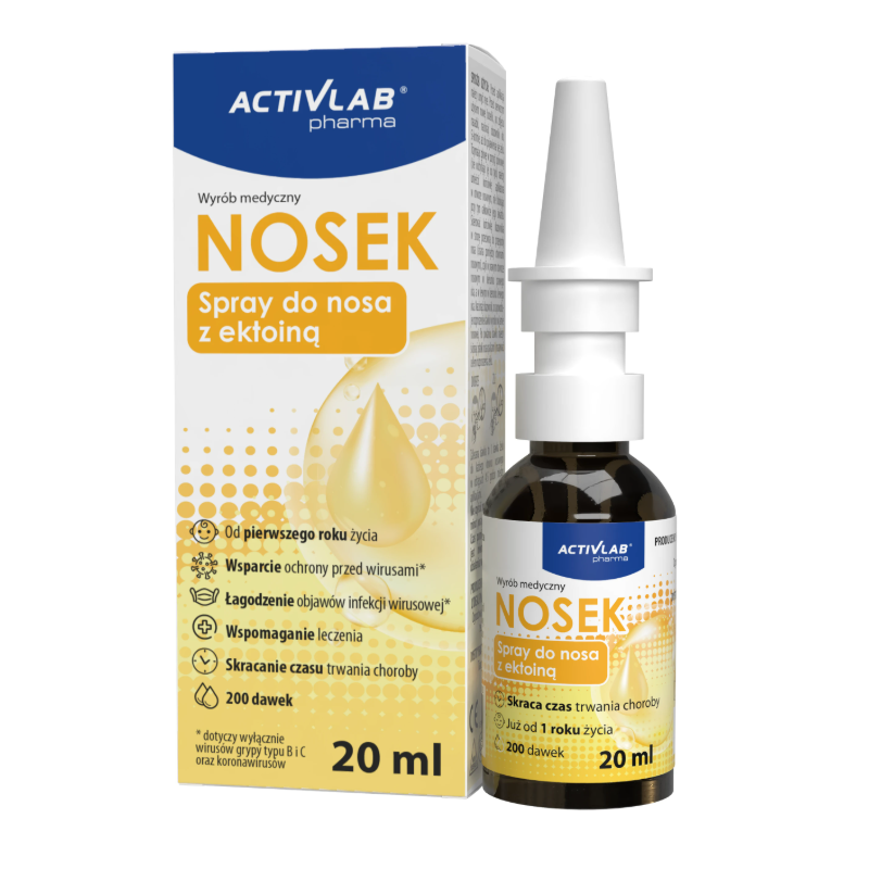 Nosek Spray Activlab Pharma to wyrób medyczny przeznaczony do codziennego stosowania, który przyczynia się do ochrony przed infekcjami wirusowymi, a także przyczynia się do łagodzenia objawów infekcji wirusowych takich jak: grypa wywołana wirusami grypy typu B i C, przeziębienie wywołane przez koronawirusy.
