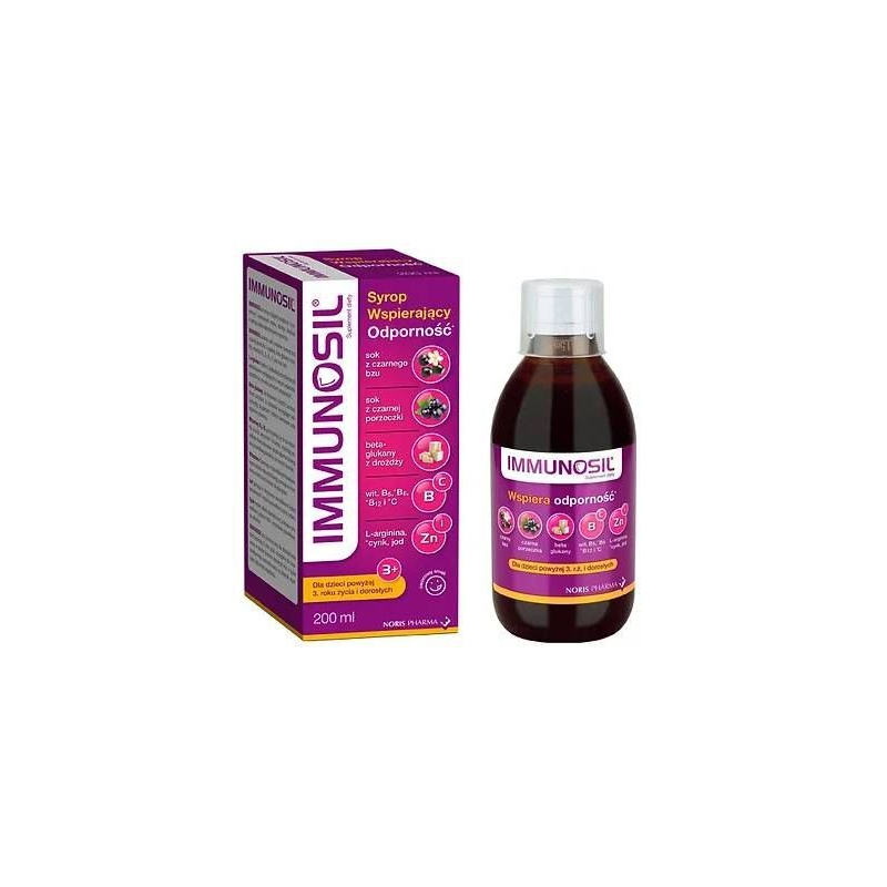 Immunosil Syrop to suplement diety w postaci pasteryzowanego syropu o pojemności 200 ml, stworzony przez renomowaną markę Noris Pharma. Produkt został opracowany z myślą o wspieraniu prawidłowego funkcjonowania układu odpornościowego u dzieci powyżej 3. roku życia oraz dorosłych.