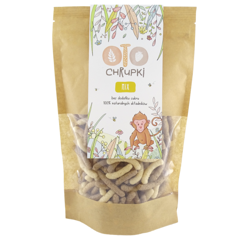 Wielozbożowe chrupki w formie chrupiących pałeczek, stanowiące unikalną mieszankę trzech smaków: orkiszowego, gryczanego oraz kakaowego. Zawierają one w swoim składzie pełnoziarnisty orkisz, bogatą w magnez i antyoksydanty kaszę gryczaną oraz naturalne kakao. OTO Chrupki MIX to produkt stworzony w 100% z naturalnych składników, bez dodatku cukru, sztucznych barwników oraz GMO, stanowiący wartościową i lekką alternatywę dla tradycyjnych przekąsek kukurydzianych.