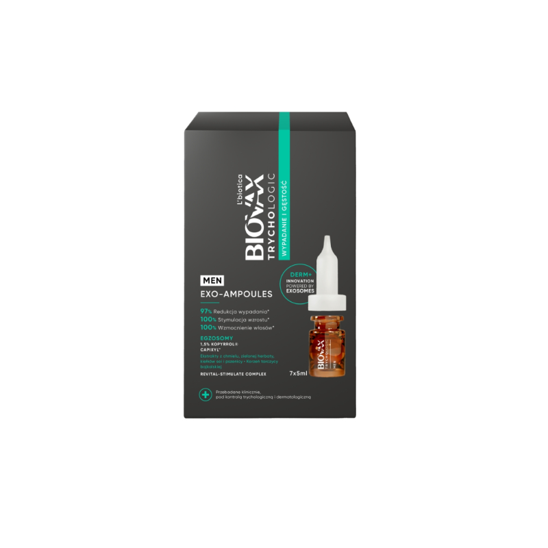 ZASTOSOWANIE: Intensywna kuracja trychologiczna przeciw wypadaniu włosów dla mężczyzn. Produkt przeznaczony dla osób zmagających się z: postępującym wypadaniem włosów o podłożu stresowym lub związanym z wiekiem, łysieniem androgenowym, wypadaniem pocovidowym oraz po leczeniu onkologicznym. Formuła oparta na technologii egzosomów, 1,5% Kopyrrolu® oraz kompleksie Capixyl™ stymuluje wzrost nowych włosów, hamuje ich wypadanie i poprawia zakotwiczenie cebulek, nie obciążając przy tym fryzury.