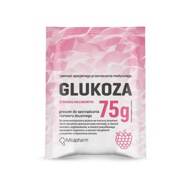 Milapharm Glukoza o smaku malinowym to dietetyczny środek spożywczy specjalnego przeznaczenia medycznego stosowany głównie w celu wykonania doustnego testu tolerancji glukozy, czyli tzw. krzywej cukrowej.