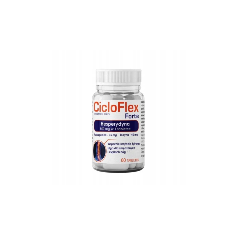 CicloFlex Forte to suplement diety z hesperydyną, kasztanowcem, ruszczykiem i witaminą C. Składniki tabletek wspierają krążenie żylne i mikrokrążenie, w efekcie pomagają zmniejszyć uczucie ciężkości i zmęczenia nóg. Preparat dla osób dorosłych z problemem ciężkich zmęczonych nóg.
